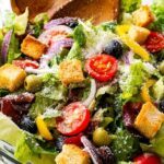 Enjoy a crisp, fresh Olive Garden Salad featuring a vibrant mix of lettuce, cabbage, carrots, tomatoes, olives, and pepperoncini, all tossed in a tangy homemade Italian dressing with parmesan and croutons for a delightful crunch. Perfect as a side dish or light meal.