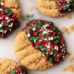 These Peanut Butter Christmas Cookies are a festive treat featuring a classic peanut butter cookie base dipped in melted semi-sweet chocolate and topped with holiday sprinkles. Soft, chewy, and decorated for the holidays, they make the perfect sweet snack or dessert for celebrations.