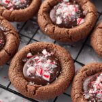 Delight in these festive Peppermint Thumbprint Cookies, combining rich cocoa-flavored sugar cookie dough with melted chocolate almond bark and a crunchy peppermint candy cane topping. Perfect for holiday celebrations or a sweet treat any time of year.