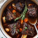 - Braise the Short Ribs: Return the seared short ribs to the pot. Add the beef broth, crispy bacon, thyme sprigs, and rosemary sprigs. Cover the pot, reduce heat to low, and cook for 2 to 2 hours 30 minutes until the meat is very tender and falling apart.
