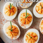 I’ve served these eggs on a rustic wooden platter lined with fresh sage and small pumpkins around the edges for Thanksgiving. For Halloween, I’m all about adding edible gold leaf and spooky toothpick toppers to really wow the crowd.