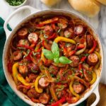 I reheat leftovers gently in a skillet over low heat, adding a splash of chicken broth if the sauce has thickened too much. This keeps the sausages juicy and the peppers tender without drying out the dish.