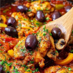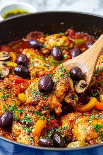 - Finish and Serve: Remove the skillet from the oven, top the cacciatore with pitted Kalamata olives and sprinkle with fresh chopped parsley. Serve the dish hot over noodles, rice, or polenta for a complete meal.