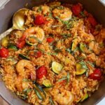 This Shrimp and Rice Skillet is a flavorful one-pan meal featuring tender shrimp, vibrant zucchini, cherry tomatoes, and seasoned rice cooked in a savory tomato and chicken broth base. Easy to prepare and perfect for a weeknight dinner, it offers a balanced blend of protein, veggies, and grains.