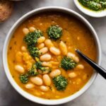 A hearty and flavorful Simple Bean Soup made with cannellini beans, fresh herbs, and a rich tomato base, thickened with pureed soup and enhanced with a vibrant homemade picada topping. Perfect for a comforting vegetarian meal, served with crusty bread.