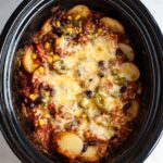 A hearty and comforting Crock Pot Cowboy Casserole featuring ground beef, potatoes, carrots, black-eyed peas, corn, and a rich blend of spices slow-cooked until tender, topped with melted cheese for an easy and satisfying meal.