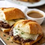 Slow Cooker French Dip Sandwiches are tender, flavorful shredded beef sandwiches slow-cooked to perfection with onion soup mix and beef broth. Served on crusty rolls with melted Swiss or provolone cheese and dipped in savory au jus, they make a delicious and comforting main course perfect for easy gatherings or weeknight dinners.