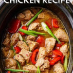 A flavorful Slow Cooker Salt & Pepper Sticky Chicken recipe featuring tender chicken breast chunks cooked with soy sauce, ginger, Chinese five spice, and black pepper, finished with fresh red peppers and spring onions for a deliciously sticky and spicy dish perfect for serving with rice.