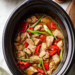 A flavorful Slow Cooker Salt & Pepper Sticky Chicken recipe featuring tender chicken breast chunks cooked with soy sauce, ginger, Chinese five spice, and black pepper, finished with fresh red peppers and spring onions for a deliciously sticky and spicy dish perfect for serving with rice.