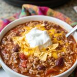 Transfer the browned beef into your slow cooker, then add chopped onion, minced garlic, fire-roasted tomatoes, chili beans, black beans, tomato sauce, and beef broth. Give it a gentle stir to combine everything. I tend to leave the rice out here, adding it later to keep it from getting mushy.