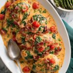A flavorful and hearty Smothered BLT Chicken recipe featuring tender pan-seared chicken breasts topped with a savory bacon, spinach, and tomato cream sauce.