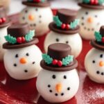 - Add Hats: Place the prepared chocolate hats on top of the snowman heads. If the coating has already set, use a little melted chocolate as glue and hold the hat steady for a few seconds to secure. Repeat for all balls.