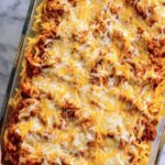 - Assemble casserole: Place half of the noodles into the bottom of the prepared baking dish. Top with half of the sauce, then half of the shredded cheese. Repeat layers with remaining noodles, sauce, and cheese.