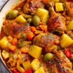 A flavorful Spanish Chicken Stew featuring tender bone-in chicken simmered with smoky paprika, aromatic spices, saffron, vegetables, and Spanish green olives. Perfectly comforting and delicious, this stew pairs wonderfully with garlic rice or mashed potatoes.