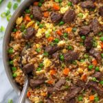 This Beef Fried Rice recipe features tender strips of steak stir-fried with cold, crispy rice and a savory sauce combination of soy sauce, beef broth, honey, and spices. Enhanced with scrambled eggs, peas, carrots, green onions, garlic, and onions, this dish delivers a perfect balance of flavors and textures, ideal for a comforting main course that’s easy to prepare.