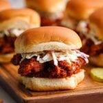 These Nashville Hot Chicken Sliders feature spicy, crispy, juicy fried chicken tenders nestled in soft slider buns with tangy coleslaw, sliced pickles, and a delicious homemade sauce. Perfect for parties or casual dinners, they bring the authentic Nashville hot chicken flavor right to your kitchen.