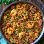 A flavorful and hearty Louisiana-style jambalaya featuring smoky andouille sausage, tender chicken, fresh vegetables, and succulent shrimp all cooked together with aromatic spices and rice for a satisfying one-pot meal.