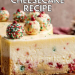 This Sugar Cookie Cheesecake combines a festive sugar cookie crust, chewy cookie dough balls mixed into a creamy cheesecake, and finishes with a luscious white chocolate ganache topped with sprinkles and extra cookie dough balls. Perfect for holiday celebrations, this dessert offers a delightful texture contrast and a sweet, indulgent flavor.
