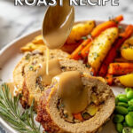 Pair this roast with classic sides like creamy mashed potatoes, roasted Brussels sprouts, glazed carrots, or a crisp cranberry sauce. It also pairs beautifully with vegan gravy to keep things cozy and traditional.